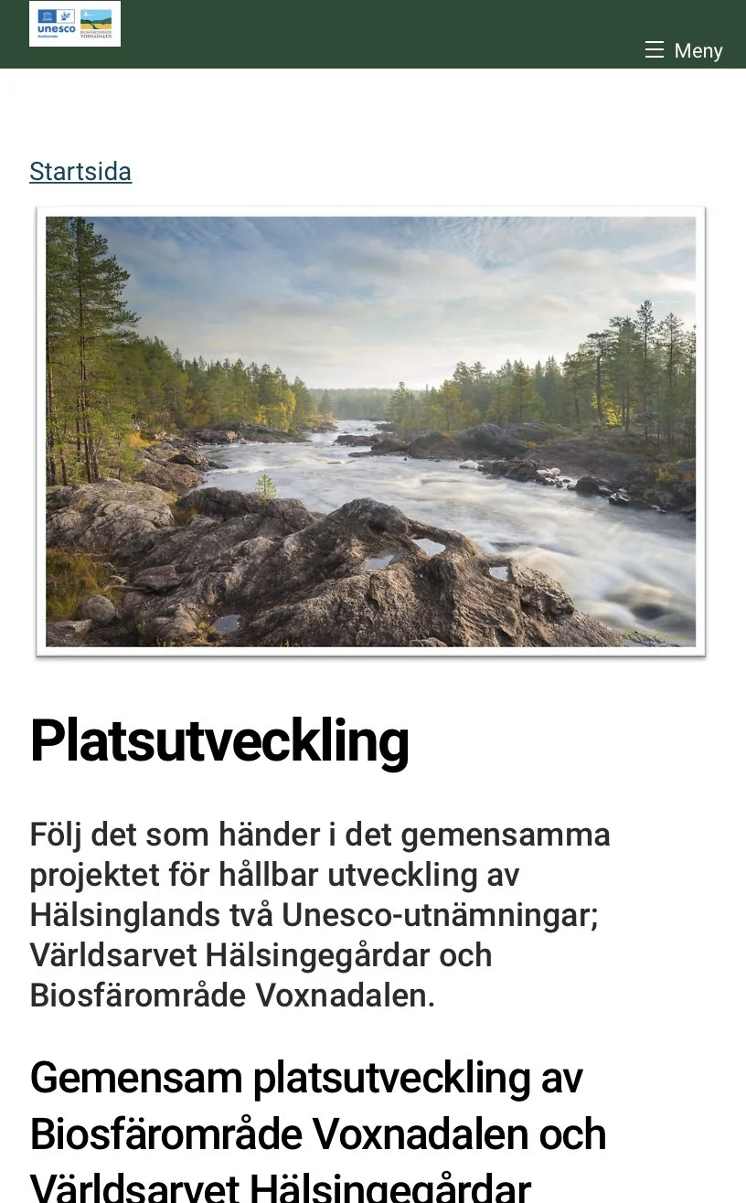 Webbsidan där vi berättar om platsutvecklings-projektet för världsarvet Biosfärområde Voxnadalen och världsarvet Hälsingegårdar lanserad idag! Projektledare är Catherine Vennberg och delprojektledare kommunikation och förankring , Maria Rosén